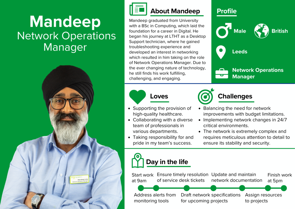 Mandeep graduated from University with a BSc in Computing, which laid the foundation for a career in Digital. He began his journey at LTHT as a Desktop Support technician, where he gained troubleshooting experience and developed an interest in networking which resulted in him taking on the role of Network Operations Manager.