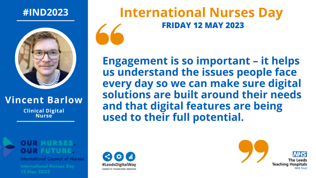 Vincent Barlow has over 15 years’ nursing experience and recently joined our Clinical Digital team, supporting digital transformation across the Trust. With the theme for International Nurses Day 2023 being ‘Our Nurses. Our Future’, Vincent provides his unique insight into the engagement work his team is doing and how this will help prepare patients, nurses, and NHS organisations for the future of digital healthcare.