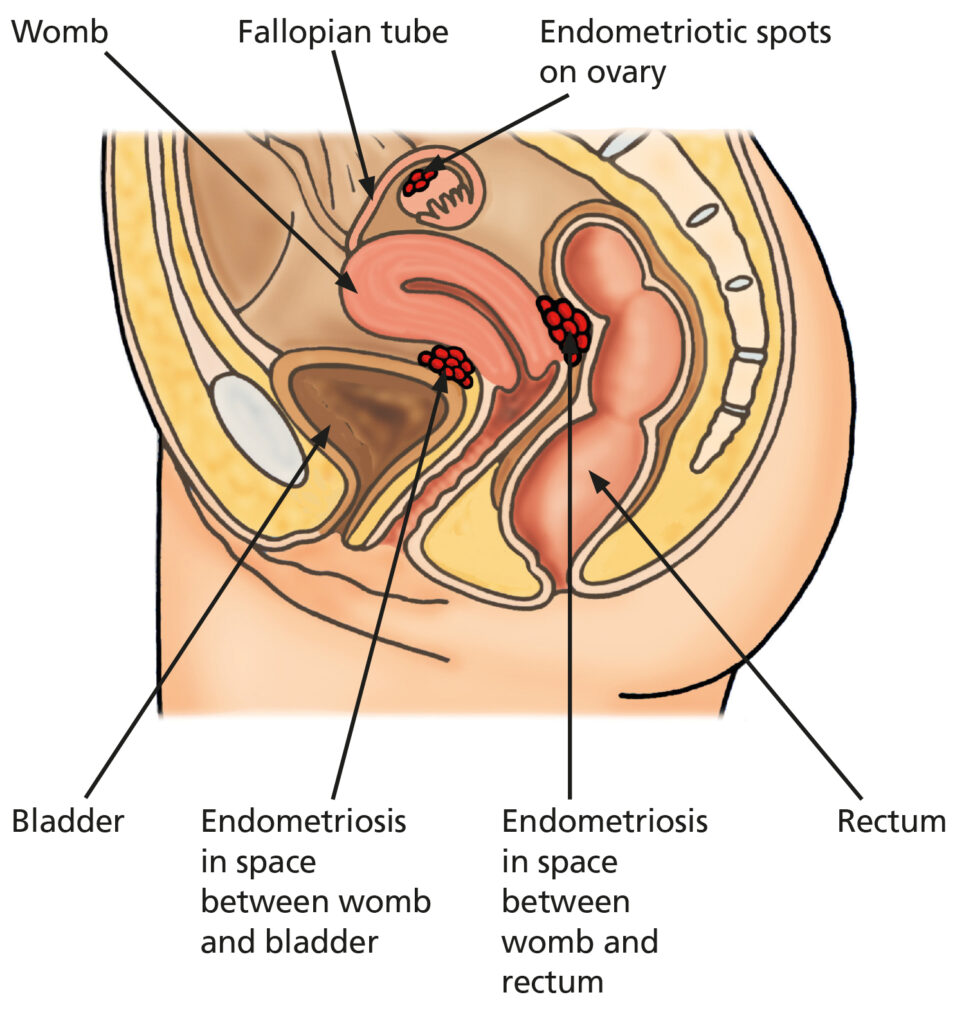 In a regular menstrual cycle the lining of the womb thickens and later bleeds as a period in response to oestrogen made by the ovaries. In the same way endometriosis grows and bleeds in response to the oestrogen. This growth of endometriosis and bleeding can cause damage and inflammation to the surrounding tissues which causes pain. As the tissues heal scarring can form (adhesions) which can stick down normally freely moving organs such as the ovaries, bowel and bladder which can cause pulling of internal lining (peritoneum) and chronic pain.