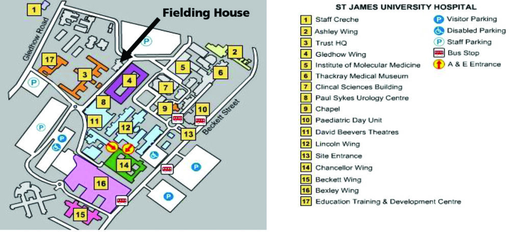 Most appointments with Neuropsychology are in-person at Fielding House, St. James’s University Hospital, Leeds. Fielding House is a separate building on the hospital site. It has free parking for patients with permits available at reception.