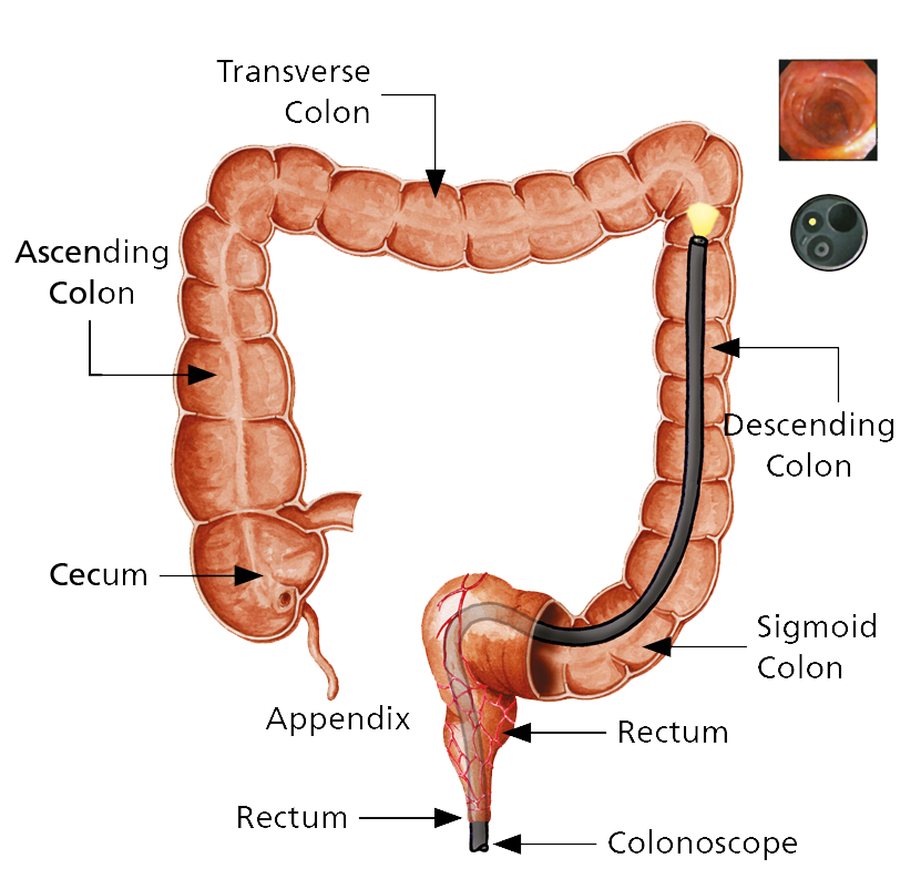 A colonoscopy is a test that examines your large bowel (colon). A long flexible tube with a camera on the end is used for this procedure and is passed through the back passage, and around the whole of your large bowel. Pictures from this camera are seen on a television screen by the endoscopist. The test takes 30 – 40 minutes minutes or more, depending on how difficult it is to pass the camera around the bends in your bowel. You can expect to be in the Endoscopy Unit for 2 – 4 hours.