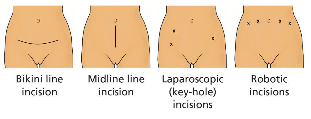 Most gynaecological operations can be performed through conventional laparoscopic (key-hole) or open abdominal routes (cut on the tummy). Some operations can also be performed vaginally (through the vagina).