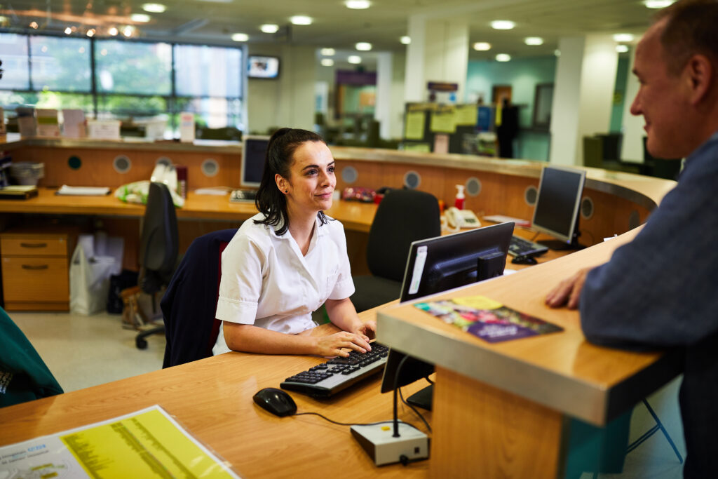 When you arrive for your treatment you should go to the radiotherapy main reception desk at the entrance of the radiotherapy department. On the first occasion you will be given all your appointments and be escorted to the waiting area for your machine.