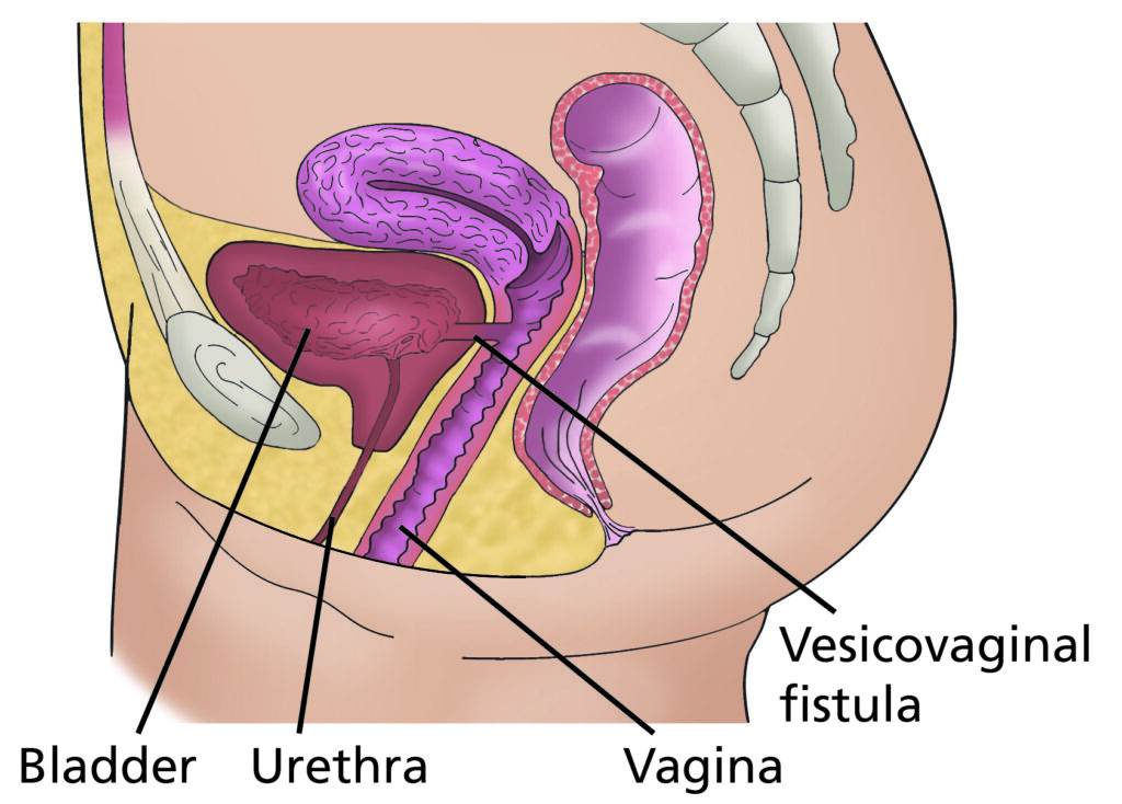 - A vesicovaginal fistula is a hole between the bladder and vagina. It allows urine to pass from the bladder to the vagina.