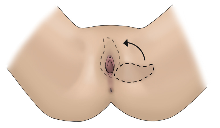 A skin flap is made from a piece of skin close to the vulva that is moved (rotated) onto the vulval area to cover the wound. This would usually be done at the same time as the