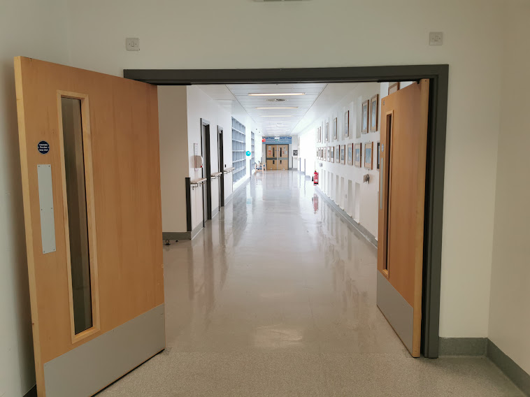 14. Head down the ramp, then continue down the corridor until you reach reception on your left. Enter reception through the double doors.
