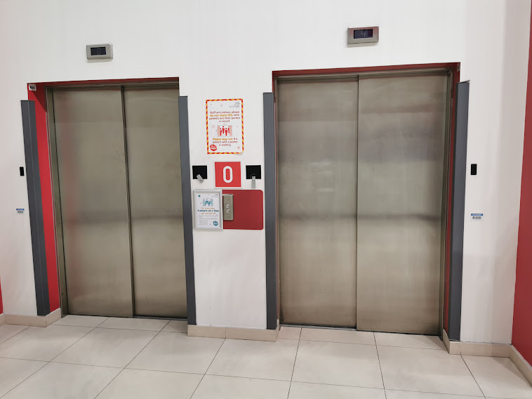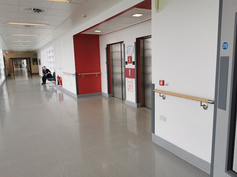 29. When you want to return to the ward, go to the red lift. To find this from reception walk along with the wall on your left, go past the green lift on your right and continue until you come to the red on your right. (Do not use the blue or green lifts)